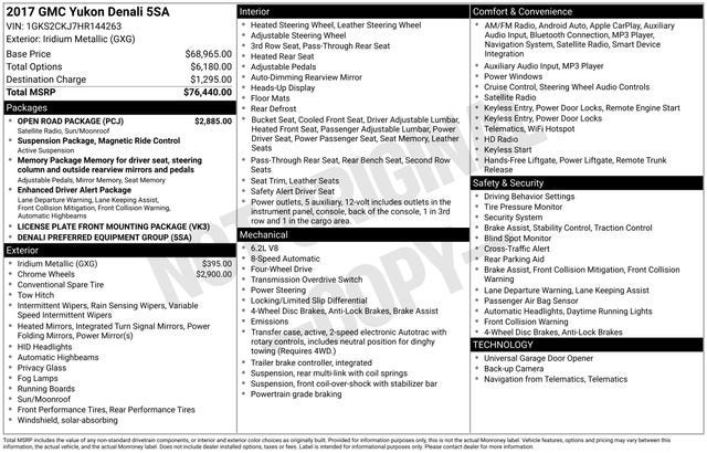 TEXT US - 1(262)671-1022.** LOCAL TRADE ** ONE OWNER ** REAR ENTERTAINMENT ** 6.2L V8 ** POWER SUNROOF ** BOSE CENTERPOINT PREMIUM 10 SPEAKER SURROUND SOUND ** HEATED AND VENTILATED FRONT SEATS ** HEATED STEERING WHEEL **2017 GMC Yukon 4D Sport Utility DenaliIridium Metallic4WD 8-Speed Automatic with Overdrive EcoTec3 6.2L V8**ONE OWNER**, **LOCAL TRADE**, **LEATHER**, **SUNROOF/MOONROOF**, **4WD**, REAR ENTERTAINMENT, 4WD, 17 Disc/Disc VAC Power Brakes, 5 Auxiliary 12-volt Power Outlets, Black Assist Steps w/Chrome Strip, Bose Centerpoint Premium 10-Speaker Surround Sound, Enhanced Driver Alert Package, Forward Collision Alert Sensor Indicator, Hands Free Power Liftgate, Heated Leather-Wrapped Steering Wheel, Inside Rear-View Auto-Dimming Mirror, Integrated Trailer Brake Controller, Intellibeam Automatic High Beam On/Off Headlamps, Lane Keep Assist, License Plate Front Mounting Package, Low Speed Forward Automatic Braking, Magnetic Ride Control Suspension Package, Memory Package, Navigation System, OnStar Basic Plan For 5 Years, OnStar w/4G LTE, Open Road Package, Passive Entry System, Power Release Second Row Bucket Seats, Power Tilt & Telescopic Steering Column, Power Tilt-Sliding Sunroof w/Express-Open/Close, Power-Adjustable Pedals For Accelerator & Brake, Preferred Equipment Group 5SA, Push Button Keyless Start, Rear Cross-Traffic Alert, Rear Seat Blu-Ray/DVD Entertainment System, Remote Keyless Entry, Side Blind Zone Alert w/Lane Change Alert, Universal Home Remote, Wheels: 22 x 9 6-Spk Chrome Multi-Feature Design, Wireless Charging.Recent Arrival!Awards:* 2017 KBB.com Brand Image AwardsReviews:* Seating for up to nine passengers; standard V8 engine delivers ample passing power and a stout tow rating; clean cabin design is one of the best in the class; available two-speed transfer case gives the Yukon the ability to tackle difficult off-road terrain. Source: Edmunds