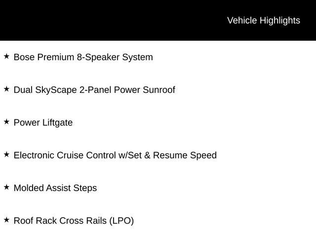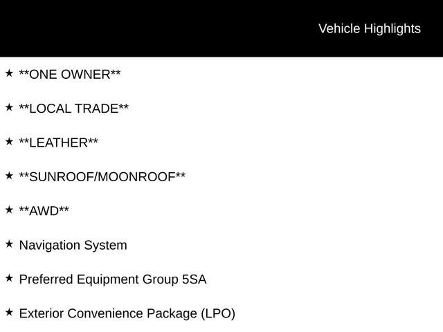 **ONE OWNER**, **LOCAL TRADE**, **LEATHER**, **SUNROOF/MOONROOF**, **AWD**, AWD, Jet Black Leather, Bose Premium 8-Speaker System, Dual SkyScape 2-Panel Power Sunroof, Electronic Cruise Control w/Set & Resume Speed, Exterior Convenience Package (LPO), Molded Assist Steps, Navigation System, Power Liftgate, Preferred Equipment Group 5SA, Roof Rack Cross Rails (LPO).