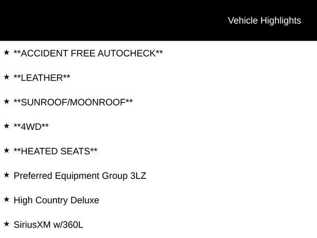 **ACCIDENT FREE AUTOCHECK**, **LEATHER**, **SUNROOF/MOONROOF**, **4WD**, **HEATED SEATS**, 4WD, Jet Black Leather, 15 Diagonal Multi-Color Head-Up Display, 1st & 2nd Row Color-Keyed Carpeted Floor Mats, 2-Speed Active Electronic AutoTrac Transfer Case, 3rd Row 60/40 Power-Folding Split-Bench Seat, Adaptive Cruise Control, Air Ride Adaptive Suspension, Bose 10-Speaker Centerpoint Surround Audio Sys Ft, Bright Front & Rear Door Sill Plates, Chrome Door Handles w/Body-Color Strip, Color-Keyed Carpeting Floor Covering, Driver & Front Outboard Passenger Airbags, Dual Exhaust System, Dual-Pane Power Panoramic Sunroof, Enhanced Automatic Emergency Braking, Enhanced Driver Information Center, Floor Console, Hands-Free Rear Power Programmable Liftgate, HD Surround Vision, Heated 2nd Row Outboard Seats, Heated Steering Wheel, High Country Deluxe, Hill Descent Control, Inside Rearview Auto-Dimming Rear Camera Mirror, Lane Change Alert w/Side Blind Zone Alert, LED Daytime Running Lamps, Memory Settings, Outside Heated Power-Adjustable Mirrors, Power Liftgate, Power Release 2nd Row Bucket Seats, Power Tilt & Telescopic Steering Column, Power-Retractable Assist Steps, Preferred Equipment Group 3LZ, Rear Camera Mirror Washer, Rear Cross Traffic Alert, Rear Pedestrian Alert, Remote Start, Safety Alert Seat, SiriusXM w/360L, Universal Home Remote, Wireless Charging, Wrapped Steering Wheel.